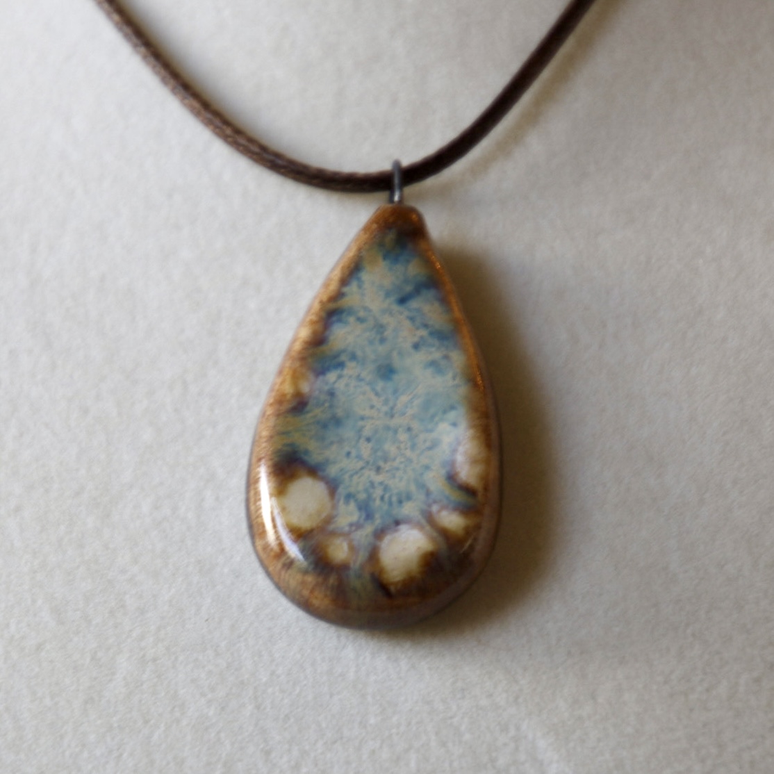 This beautiful pebble style pendant is definitely a conversation starter. It is delicate, with a beautifully mottled glaze appearance reminds me of the Petosky Stones and fossilized coral on the beaches in Northern Michigan. The 18 inch brown waxed cord, with gold clasp, is adjustable to 20 inches. Suitable for both men and women. The back of the pendant is unglazed, so feel free to add a few drops of your favorite essential oils for an uplifting or relaxing aromatherapy experience.