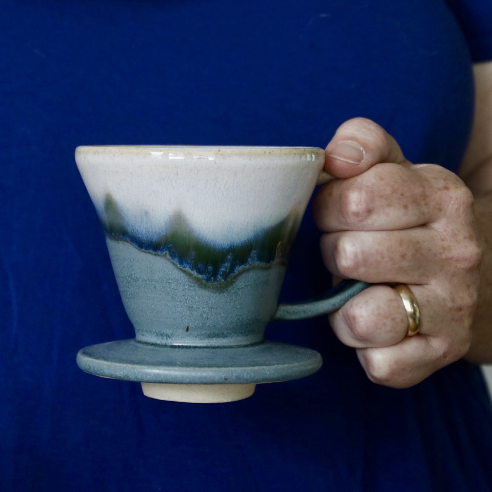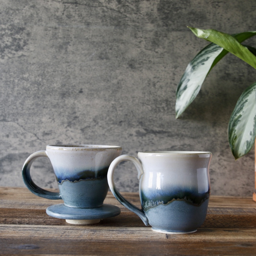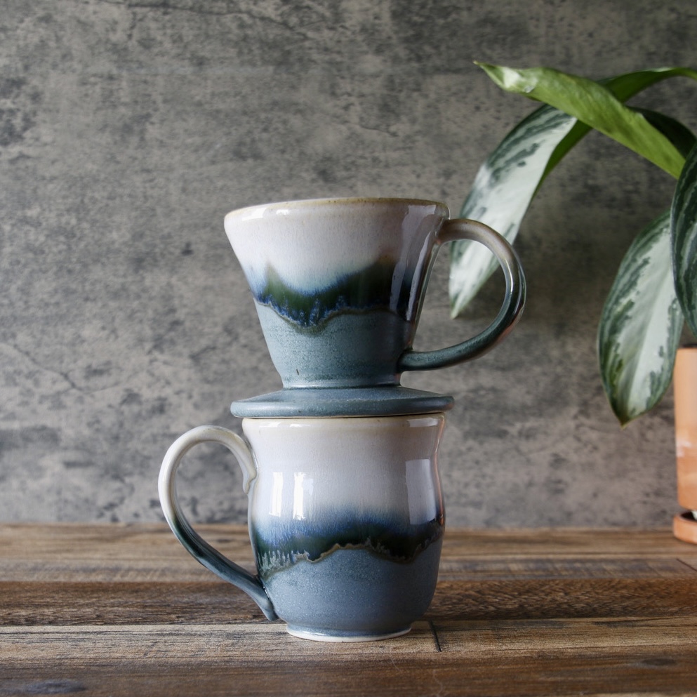 This coffee pour over set is perfect for coffee connoisseurs. It just takes a #2 cone filter, and the appropriate amount of coffee for a 10-12oz cup of coffee. The bottom of the pieces is a beautiful satiny blue-green glaze, with shiny white contrasting glaze on the top. The mug holds 10-12 oz, and has a comfy 2-3 finger handle.
