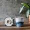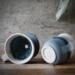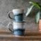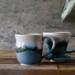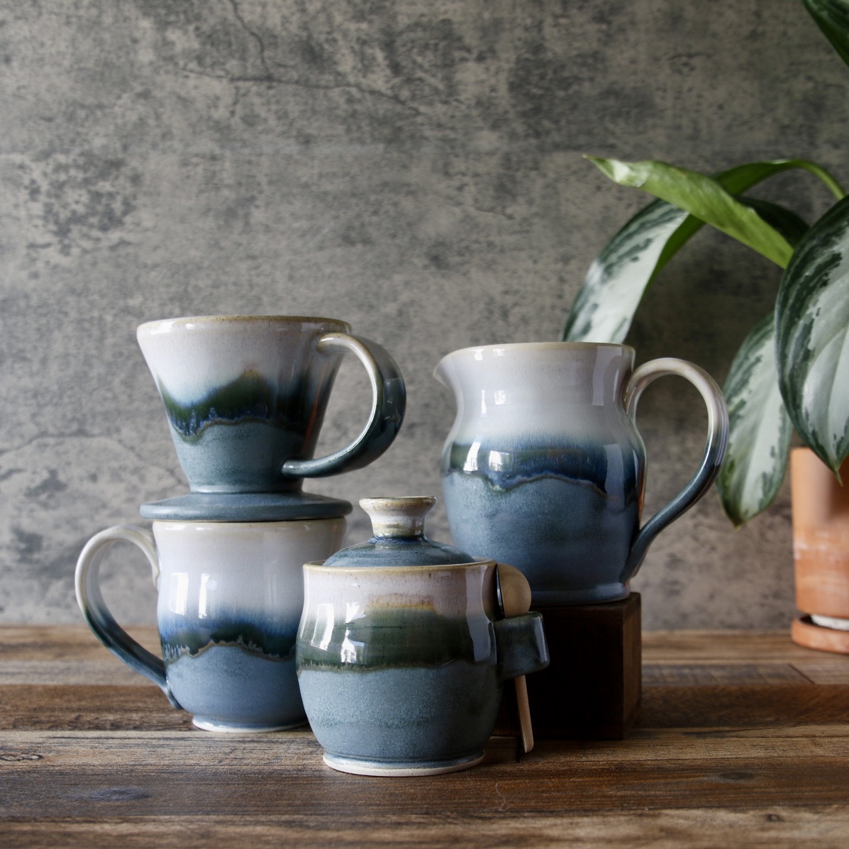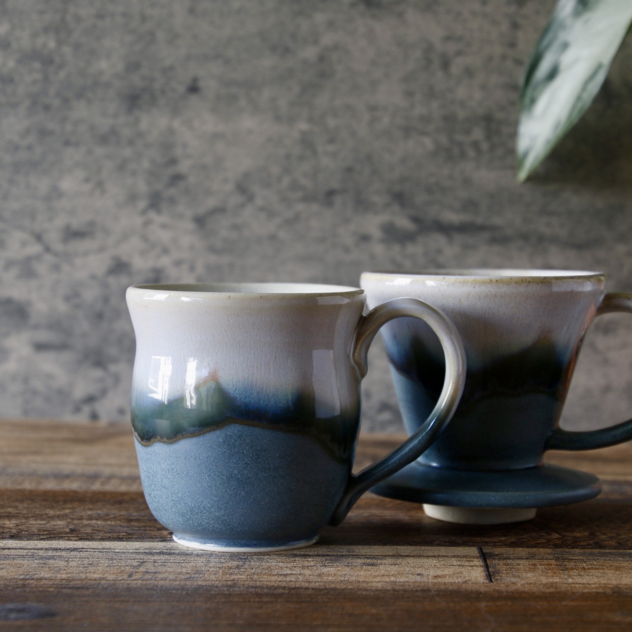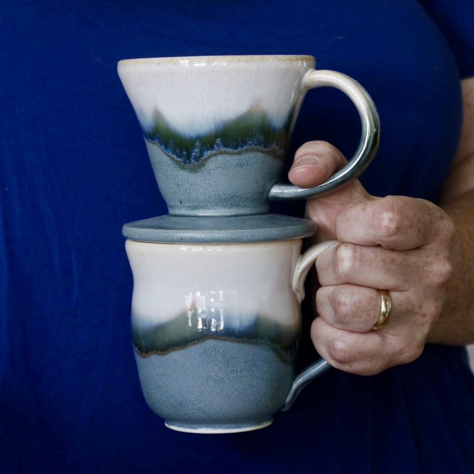 This coffee pour over set is perfect for coffee connoisseurs. It just takes a #2 cone filter, and the appropriate amount of coffee for a 10-12oz cup of coffee. The bottom of the pieces is a beautiful satiny blue-green glaze, with shiny white contrasting glaze on the top. The mug holds 10-12 oz, and has a comfy 2-3 finger handle.