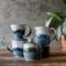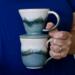 These pieces are both thrown on the pottery wheel. After drying for 24 hours, the handles are added, and the shaping and carving is done on the pour over, to make sure the water flows correctly through it. Then after the bisque fire, the pieces are hand painted with multiple layers of food safe glazes. Then they get fired one more time to create the beautiful glaze effects and achieve full vitrification of the clay.