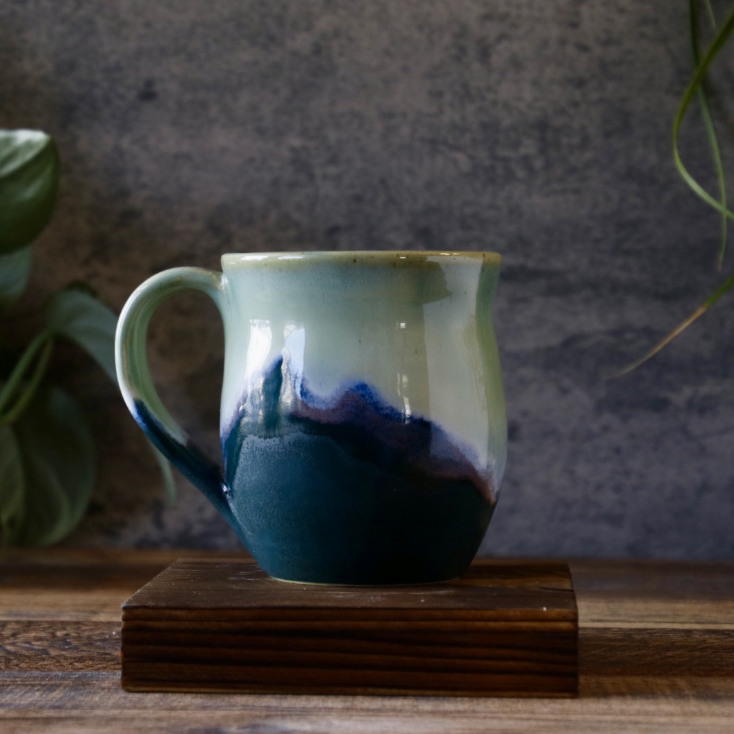 This mug is a pleasure to the senses. The bottom is a satiny matte, with the top a magical light green shiny glaze. It is a comfortable 2-3 finger handle, and holds 10-12oz of liquid. Just enough to stay hot while you drink it, and avoid the reheat in the microwave.