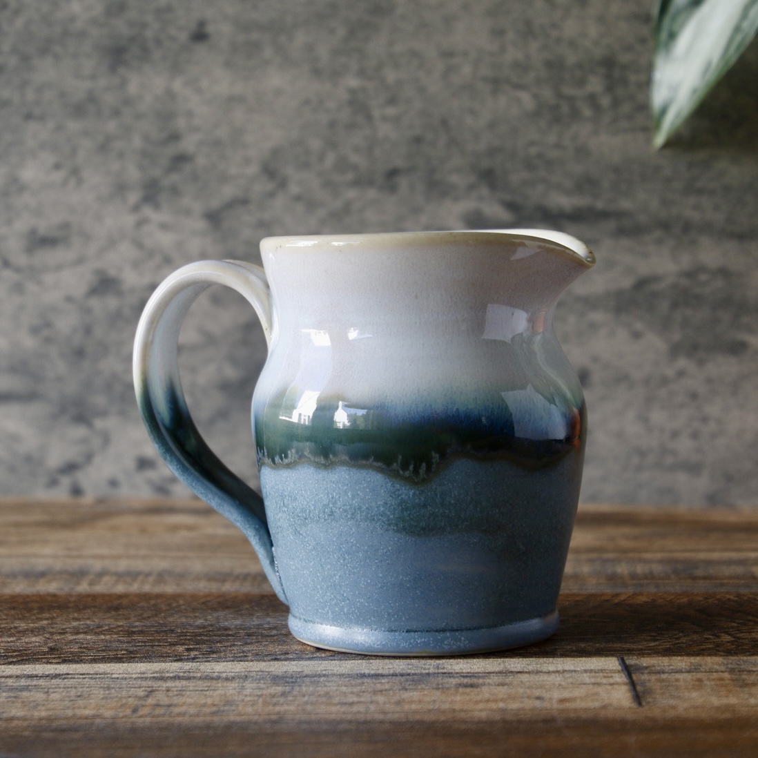 This beautiful pitcher will look lovely in any home, as decor or as a functional small pitcher for cream, milk, water, or wine. It holds up to 12oz of liquid, and would be gorgeous as a centerpiece with flowers. The bottom is a satiny smooth patina blue green color, and the top is a luminous glossy white.